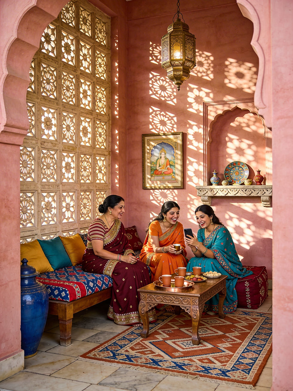 The bedroom decor ideas in Pink Sands are built on one beautiful tension: bold Rajasthani pattern and colour in the textiles, and absolute calm in the sandstone architecture that holds them. The master bedroom's deep indigo and saffron Sanganer block-print bedding, a carved teak headboard, and a single shaft of Jaipur morning light through the jharokha window is one of the most quietly extraordinary rooms our interior decorators have ever designed. The private inner courtyard — bougainvillea climbing the sandstone walls, a carved stone fountain at the centre, a family in their quietest morning ritual — is the final proof that the best living room decor ideas are sometimes the ones that lead you outside, into the open sky of a home that breathes.